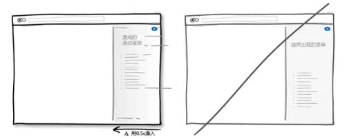 用户进行操作过程中,界面上的元素会经常出现,隐藏,打开,关闭,放大缩小移位等。给这些元素增加些自然的动画,淡入淡出效果不但美观,也更符合实际,本来元素尺寸位置的变化就是一个需要时间的动画过程。但要注意动画时间不要设置过长,那样会让想尽快完成操作的用户不耐烦。